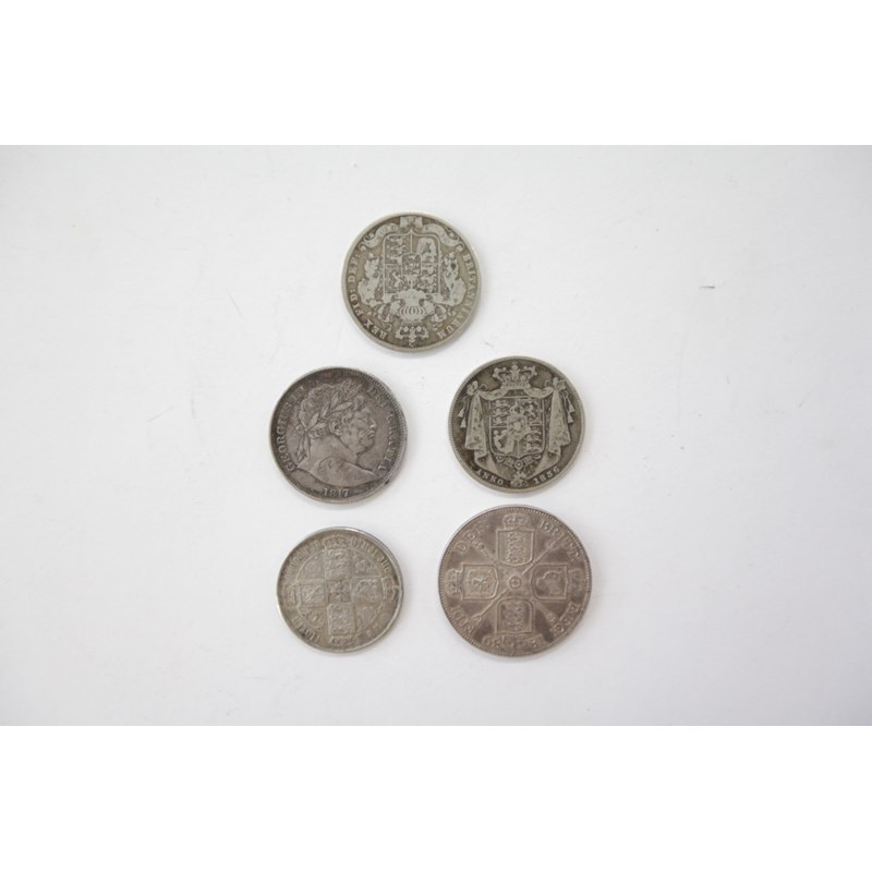 Five silver coins including 1. A George 111 Halfcrown piece dated 1817. 2. A George 1V Halfcrown piece dated 1825. 3. A William 1111 Halfcrown piece dated 1836. 4. A Victorian Gothic Florin 'XX111' dated. A Victorian Double-Florin piece dated 1889. (5)