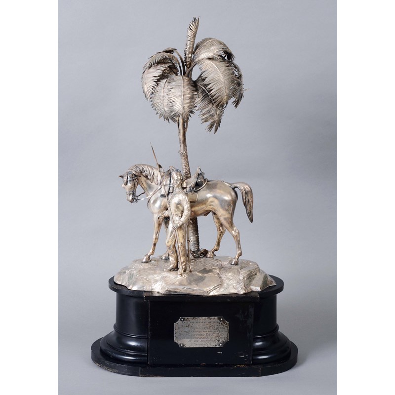 Hallmarks for 1872 by the London Makers Stephen Smith, of considerable size and fine detail. A 9th Lancers Officer with lance in hand, stood beside his horse beneath a palm tree. Complete with sword, saddle, reins, pistol, and associated patrolling equipment of the period. With rocky ground below and engraved on a plain rock-face, 'A 9th Lancer Indian Mutiny 1857-58'.