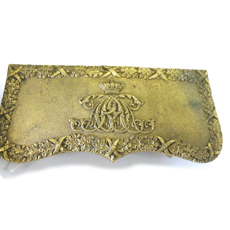 A gilt officers pouch worn by Surgeon Major John J Clifford MD, whilst serving in the 9th Dragoons. With the regiments crown over inverted AR's, surrounded by oak-leaves and crosses. Red backing and pouch itself, with side-straps and fittings in tact.
