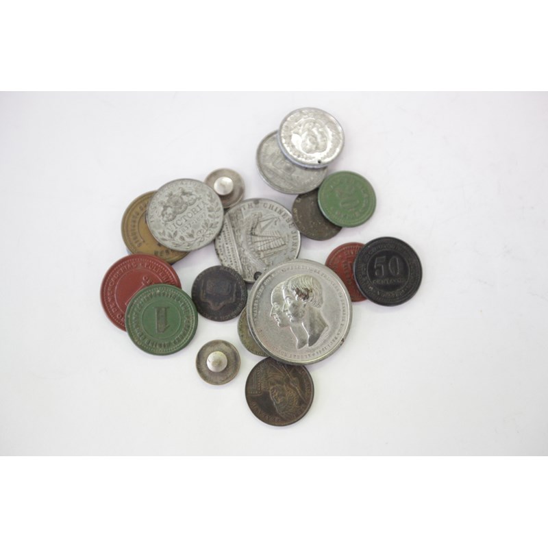 A white metal Chinese Junk Keying 45mm diameter medallion. An 1863 white metal marriage of Edward and Alexandra medallion 10th March 1863, 53mm diameter. A white metal Diamond Jubilee 1897 medallion, 38mm diameter. South American Mines Tokens in plastic and one in brass. A Shrewsbury 1794 Token Halfpenny, two 1794 Gentlemans Walk Halfpenny tokens, etc