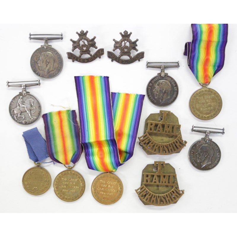British War & Victory Medals named to 2703 Pte L Sanderson RAMC. With a pair of complete brass shoulder titles to the T-RAMC-Derbyshire.