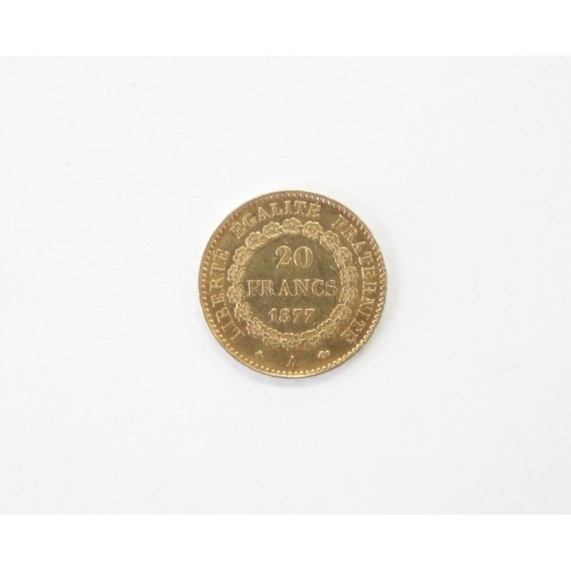 A FRENCH 20 FRANC PIECE. An Angel obverse 20 Franc Piece, dated 1877 with A in wreath.