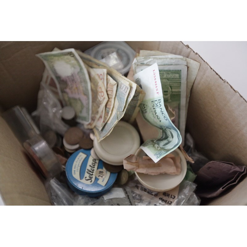 Including part silver GB coinage pre 1946, totalling over £4/6/6d. Later GB and Foreign coinage and banknotes, a Portugese X Reis piece of 1977, Roman Commmemorative coin with Romulus & Remus suckling reverse, etc