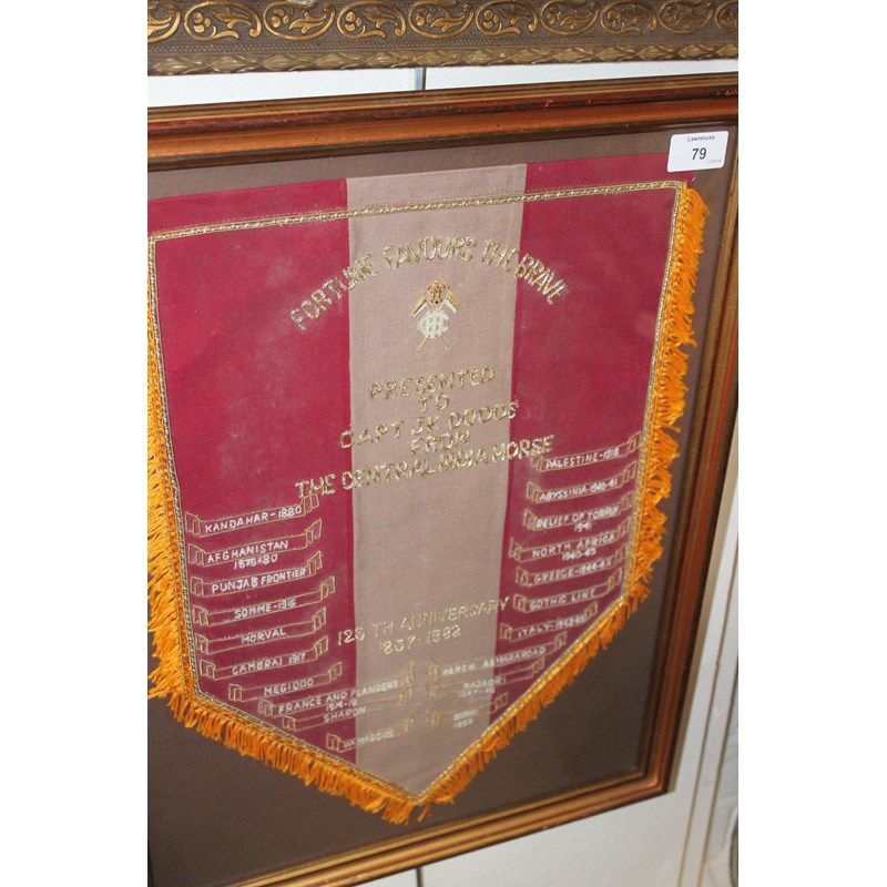 Complete with Battle Honours Kandahar to Burki 1956, also Fortune Favours the Brave. Presented to Capt J K Dodds from the Central India Horse, 125th Anniversary 1857-1982. 16.3/4" x 22". Capt Dodds served in the Regiment 1942-45 period.