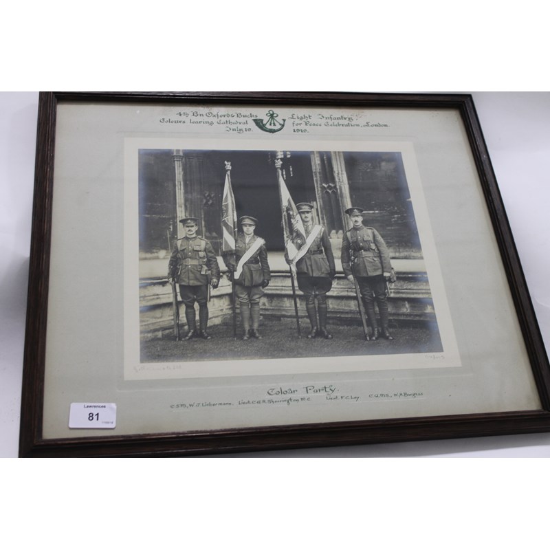 Titled the 4th Bn Ox & Bucks L Infantry with the colours leaving the Cathedral. July 1919. The Colour Party are named as CSM W J Liebermann, Lt Col C E R Sherrington MC. Lt F C Lay and C Q M Sgt W A Burgess. 19" x 15.1/2" (Glazed)