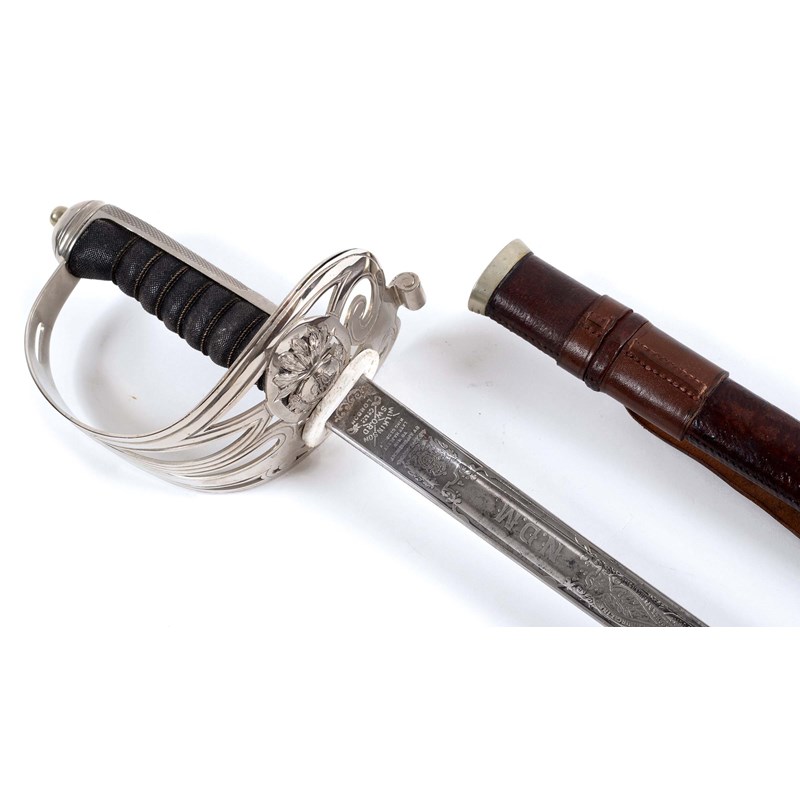 A Wilkinson made George V1 Grenadier Guards officer's sword, number 68584 complete with a scabbard. Battle honours on the 32./12" length rust damaged blade on one side are Waterloo up to Hindenburg Line-France & Flanders 1918. On the other side is Namur 1695 up to the Peninsular. Initials on the blade are N D M, the hilt in exceptional condition with G-G badge inset. Complete with its brown leather field scabbard.