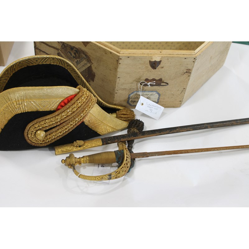 A Court Sword with gilt hilt and pommel, of a Spanish Nobleman or Diplomatic type with a rusted 29.3/4" tapering blade. Maker Jordana Principi Madrid, on the riccasso of the plated blade, with gilt mounted black leather scabbard. The ornate bicorn hat with chinstrap present, contained in a fitted wooden case. The shield in both the hilt and the hat buttons, are of a crown above with vertical divisions. On the hat button is Real Maeztranza de Caballiria de Zaragoza. A Noble Guild established for Cavalry Training, established in the 1500's. Royal Cavalry Armoury of Zaragoza..