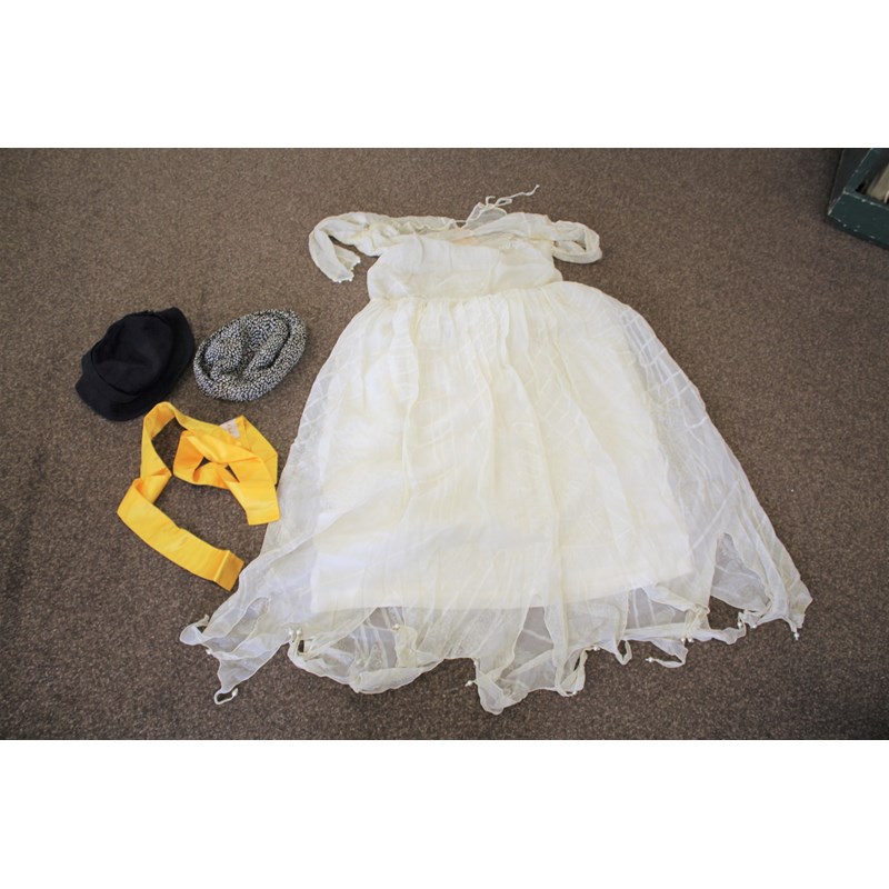 including a Zandra Rhodes 100% silk cream party dress embellished with shell shaped sequins. Also with a Zandra Rhoses pale cream printed silk dress with scalloped detail to the sleeves and waist, and 2 Jean Muir hats. (4)
