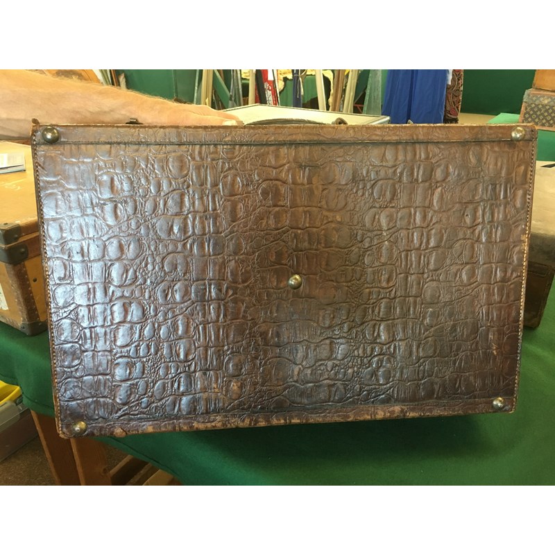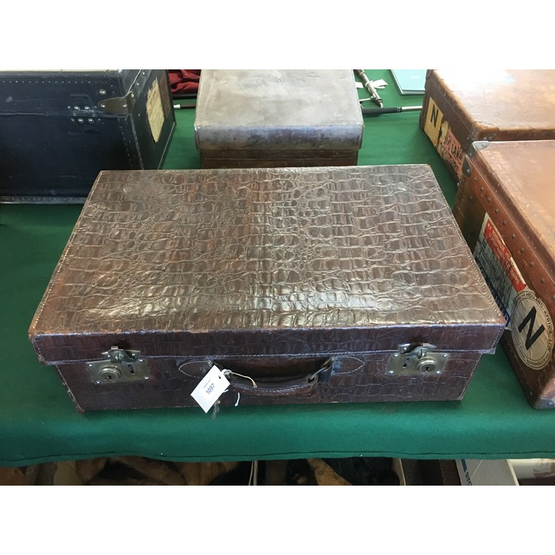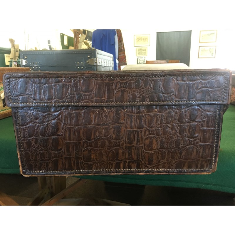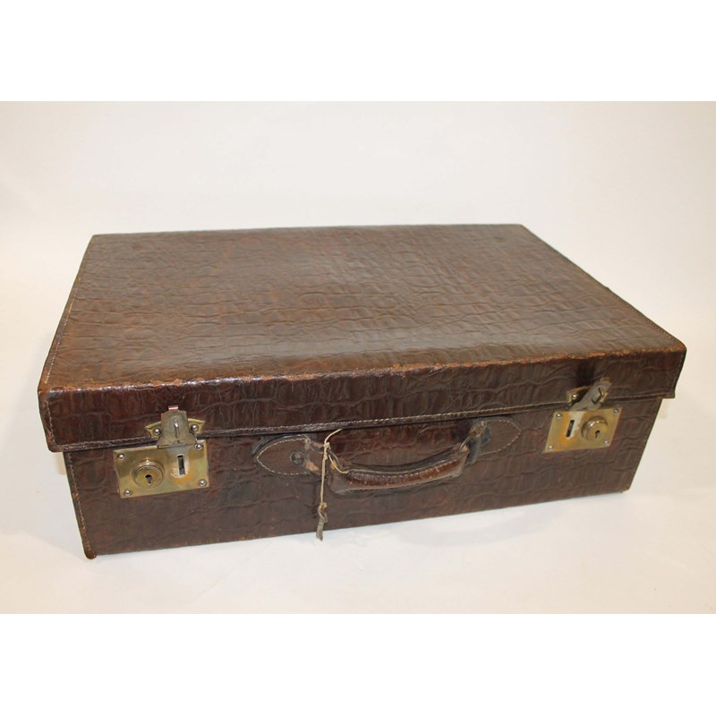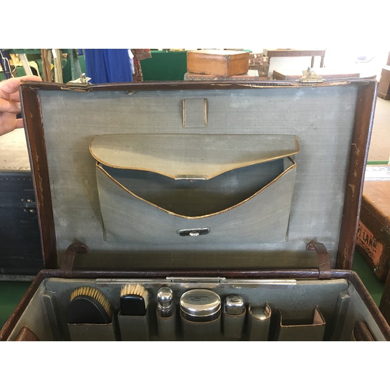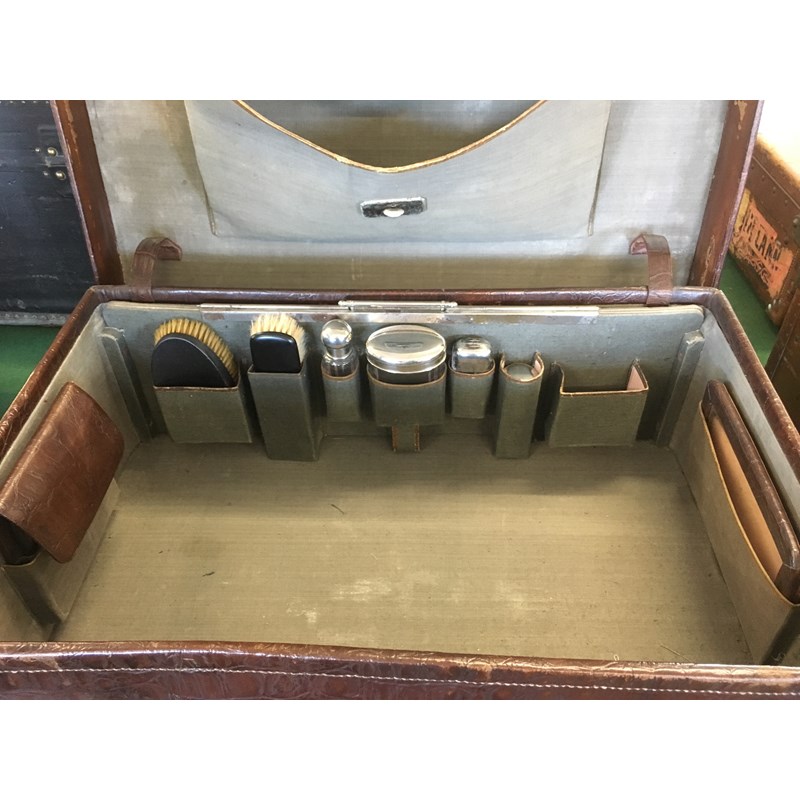a crocodile skin suitcase with a fitted interior, containing a crocodile skin mirror and manicure case with tools, dressing table brushes and jars. Fitted with brass lock plates. Case 61cms by 39cms