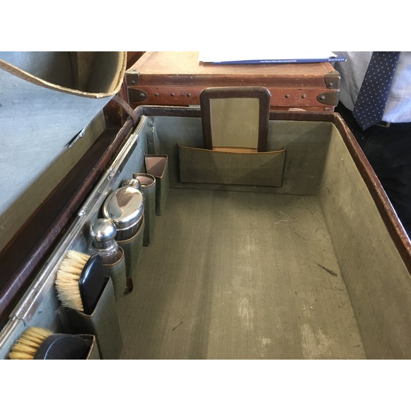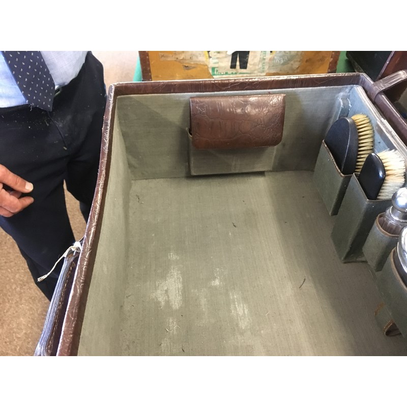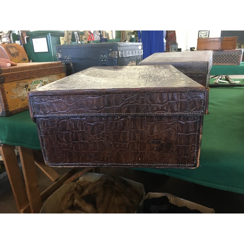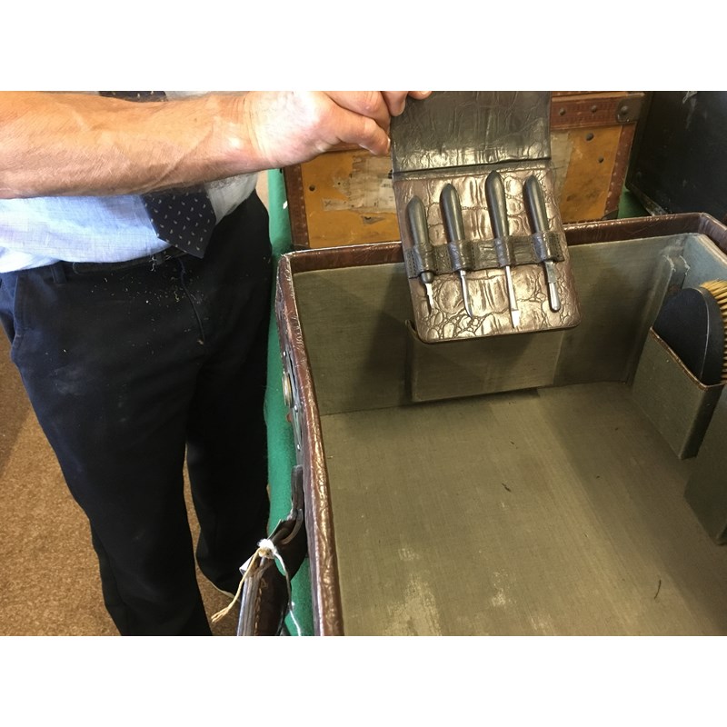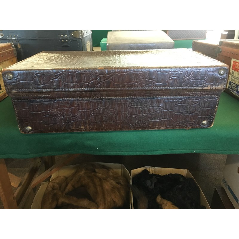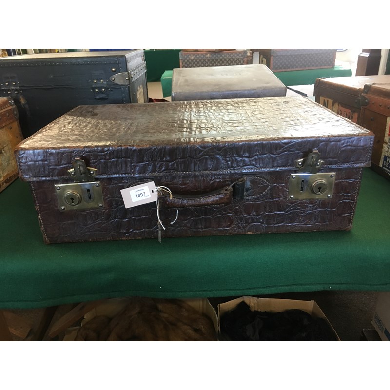 a crocodile skin suitcase with a fitted interior, containing a crocodile skin mirror and manicure case with tools, dressing table brushes and jars. Fitted with brass lock plates. Case 61cms by 39cms