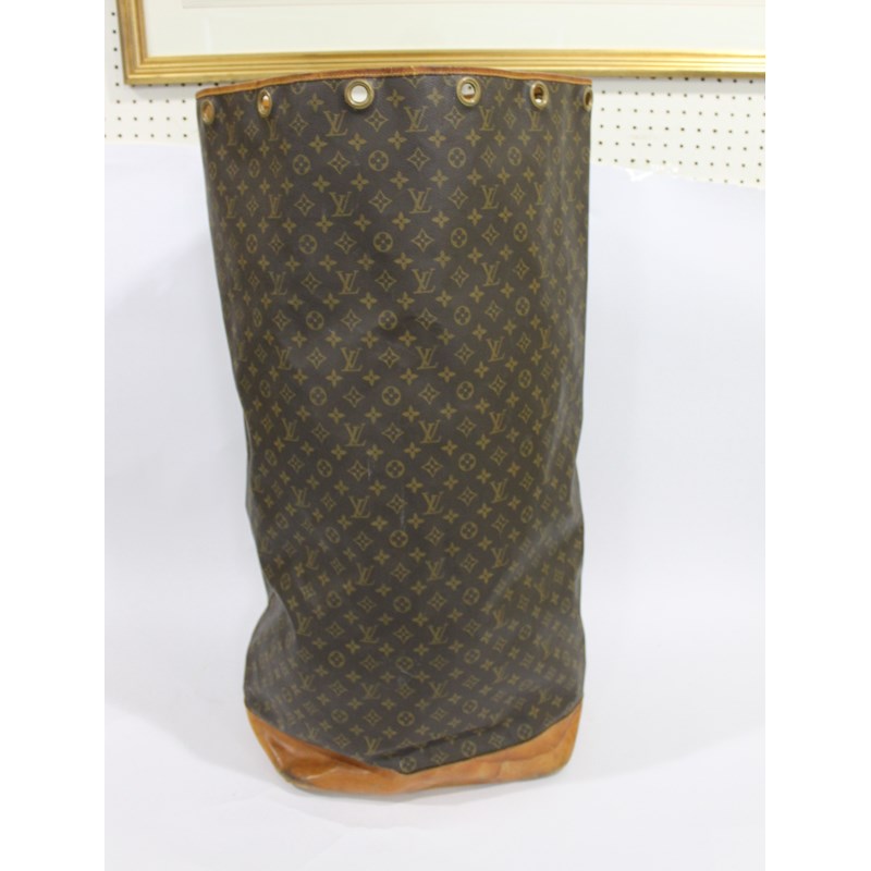 a large Vuitton bag or sack, with monogrammed exterior and with holes around the rim. Missing it's cord or rope to hold the top together. Marked on the base, Louis Vuitton, Paris, Made in France. 89cms high
