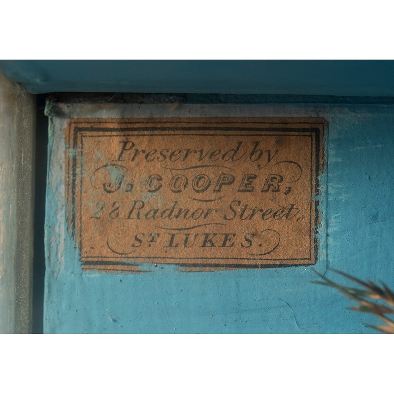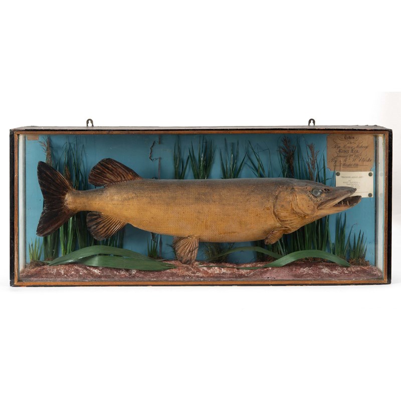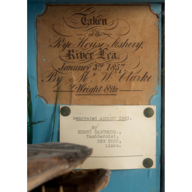 a cased pike with a label for J Cooper, Radner St, St Lukes, with a label inside which reads Taken at the Rye House Fishery, River Lea, Jan 3rd 1857 by M W Clarke, Weight 8lbs. With a further label, Renovated August 1963 by Henry Cawthorn, Taxidermist, Lincs. Case 66cms across, 34cms high