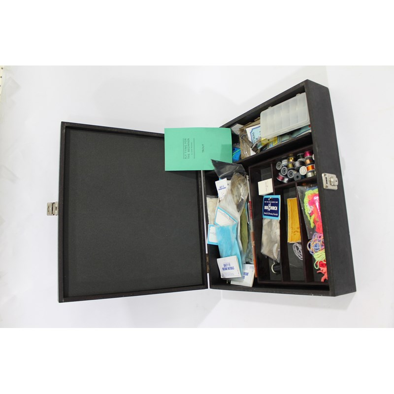 a wooden box with a variety of fly tying accessories, including feathers in packets (Bob Church), reels of thread, cramp etc. Also with various rods, leeda reel, Mitchell reel, and various accessories.