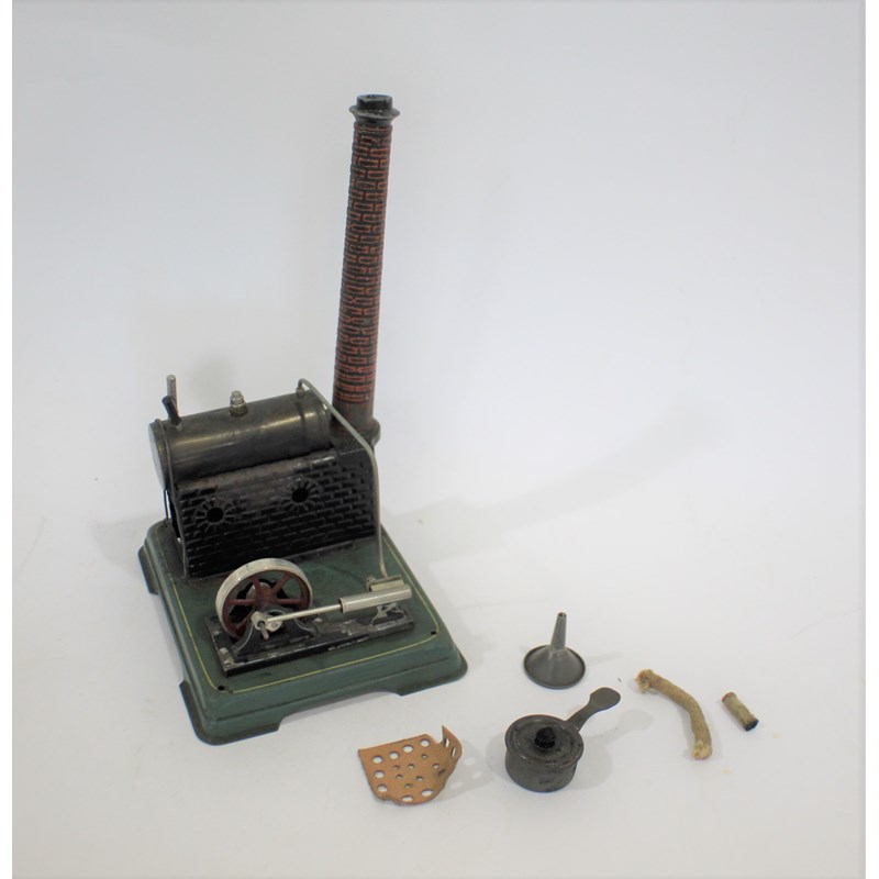 MODEL STEAM ENGINE a tin plate stationary model of a horizontal steam engine with fly wheel and chimney. Also with a burner, unmarked. 28cms high
