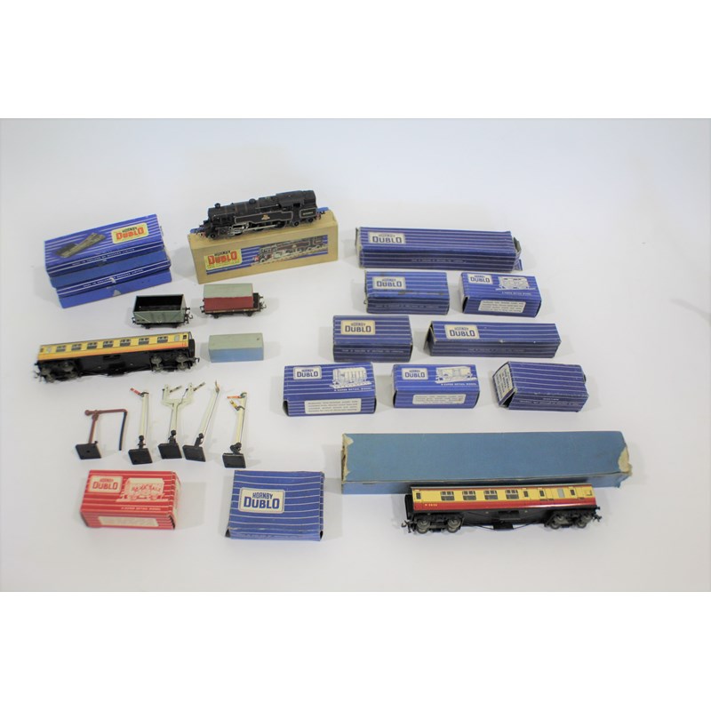 a mixed lot including a boxed locomotive EDL 18 80054 Tank Loco (box partly repaired), and various boxed rolling stock including 4665 Saxa Salt, D1 Meat Van, SD6 Cattle Wagon, SD6 Grain Wagon, D12 Corridor Coach, SD 6 Mineral Wagon, D1 Petrol Tank Wagon, D1 Bogie Bolster, boxed points etc. Also with some unboxed items, unboxed track etc.