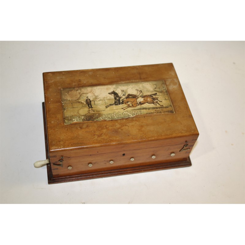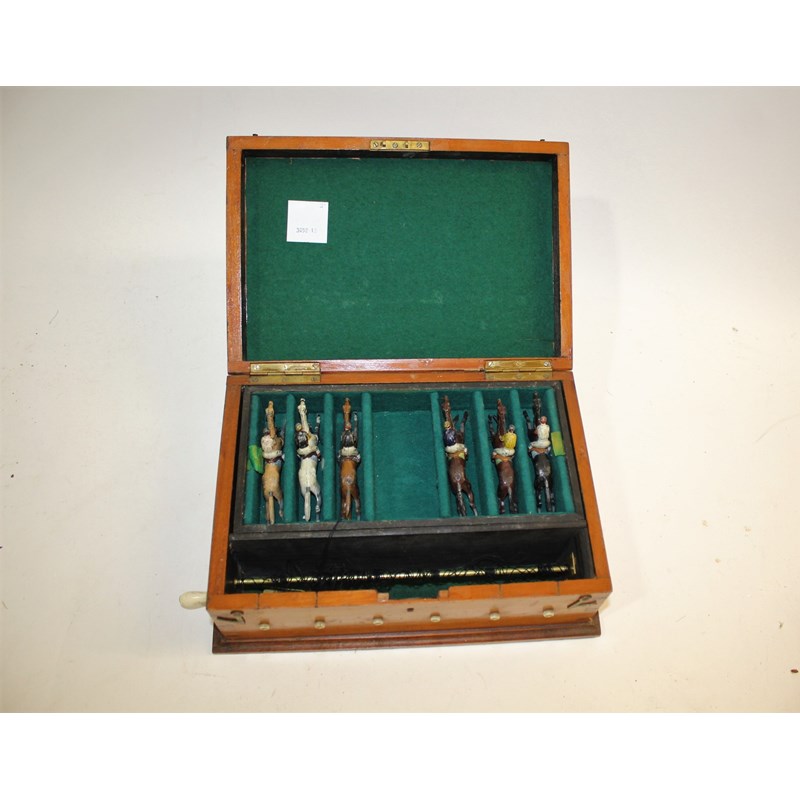 JAQUES & SON - ASCOT NEW RACING GAME the box containing 6 painted horses and jockey's, and with a bone handled brass winder and instruction booklet.
