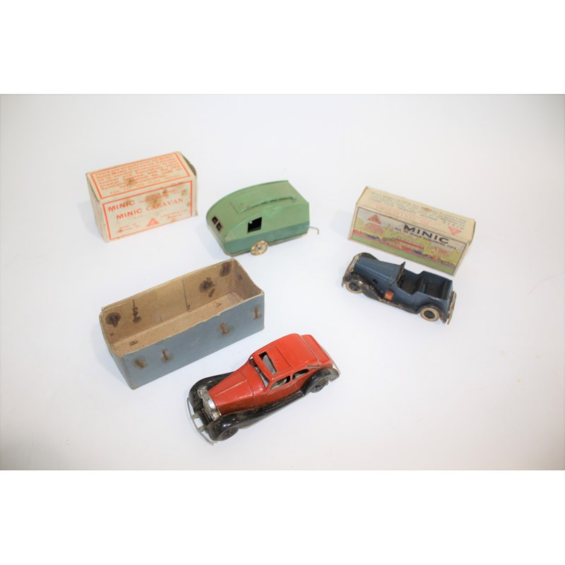 including a boxed 38M Triang Minic Caravan (Non Electric), also with a Triang Minic Tourer (not it's correct box), and another Triang Minic car. All with some corrosion. (3)