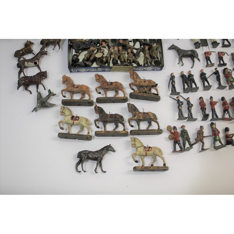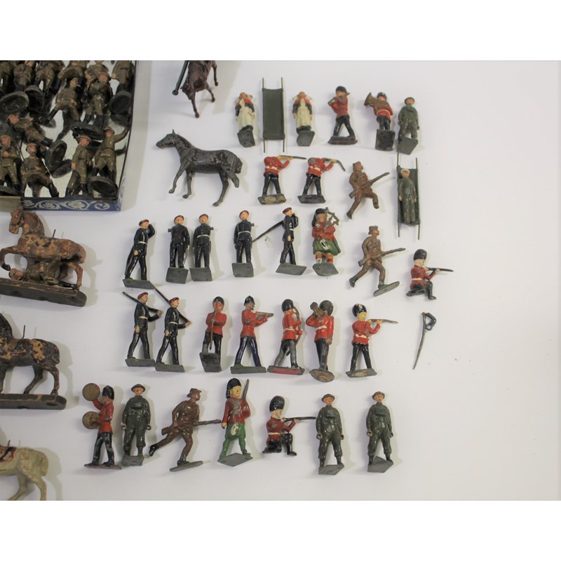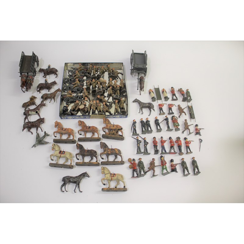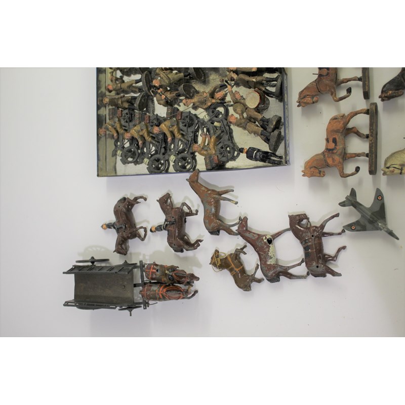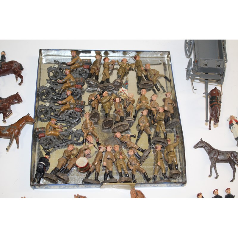 QTY OF MILITARY FIGURES including various Elastolin model soldiers and wooden horses, various Britains model soldiers, Nurses, Horses including two carts, Military figures on Motorbikes, etc.