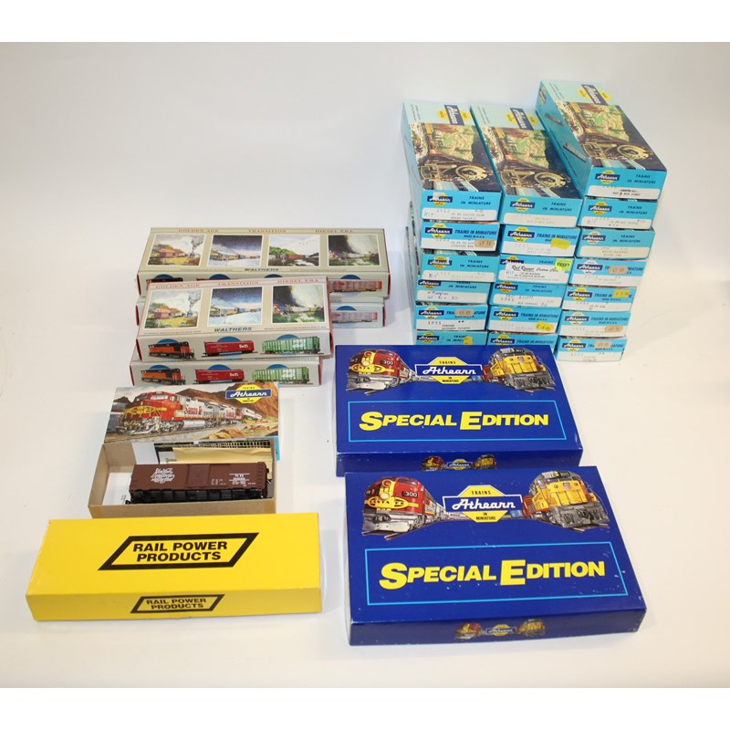 A mixed lot including Athearn Special Edition 2314 Burlington, and 2320 Rock Island, and various boxed Athearn models (mostly assembled or part assembled) including 2076 Santa Fe, 1912 Union Pacific, 1911 Southern Pacific, 3202 Santa Fe, 2076 Santa Fe, 5305 MKT Hopper, 1779 Union Pacific, and many more. Also with Rail Power Products boxed locomotive, and boxed Walthers kits.