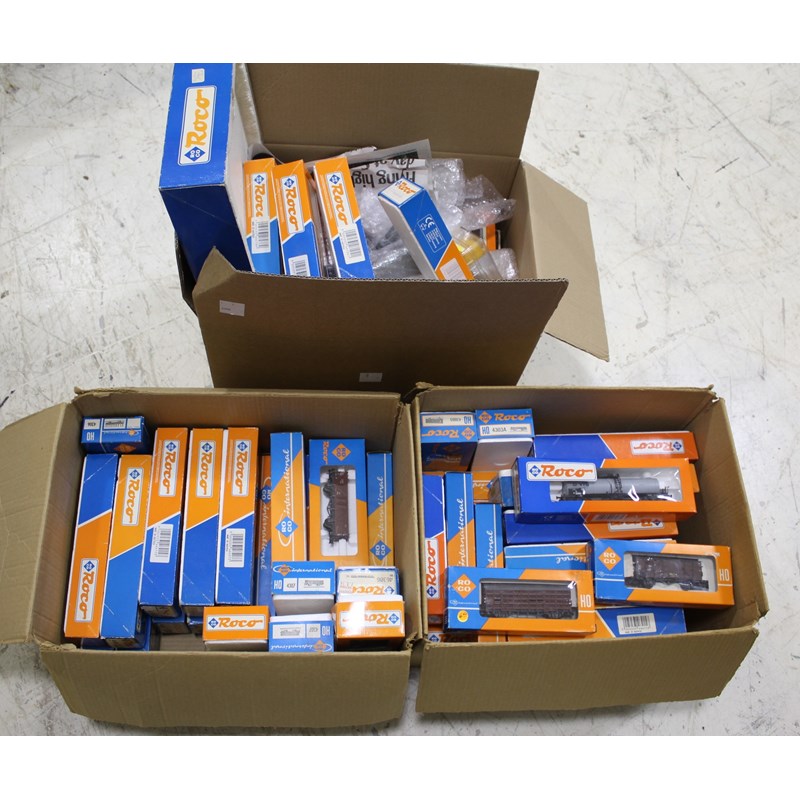 a large qty of boxed Roco rolling stock, also with a boxed Roco 8500 Tramcar (2), Roco 8504A Street Car, Jouef 8605 Autorail, AHM Boeing Trolley, and various other boxed and unboxed items.