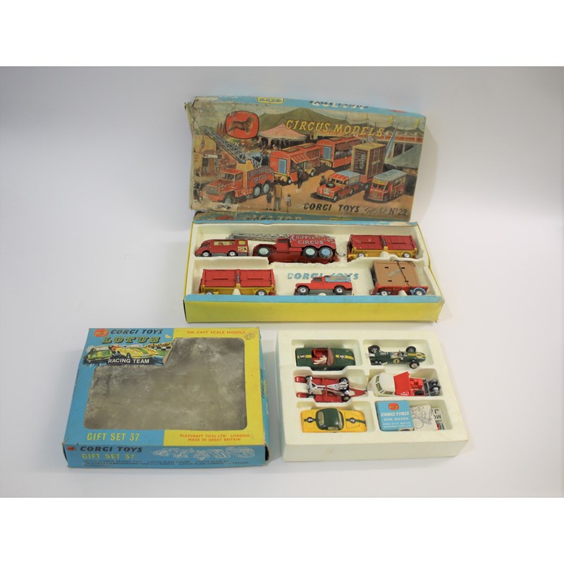 a boxed Corgi Gift Set 37 including a breakdown truck and trailer, and 3 racing cars (Lotus Climax, Lotus Elan S2 (2)), also with a small box containing wheels and bollards, stickers etc (box a bit grubby). Also with boxed Corgi Gift Set 23 Chipperfields Circus (including a Polar Bear, Elephant and Lion), box with water damage and the models marked in places, and with some additional unboxed Corgi Chipperfield's Circus trailers and some animals.