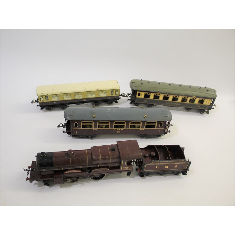a clockwork locomotive and tender, LMS Royal Scot 6100, also with a 1st class coach 402, Pullman Coach Loraine, and a 3rd Class Coach 6837. (5)