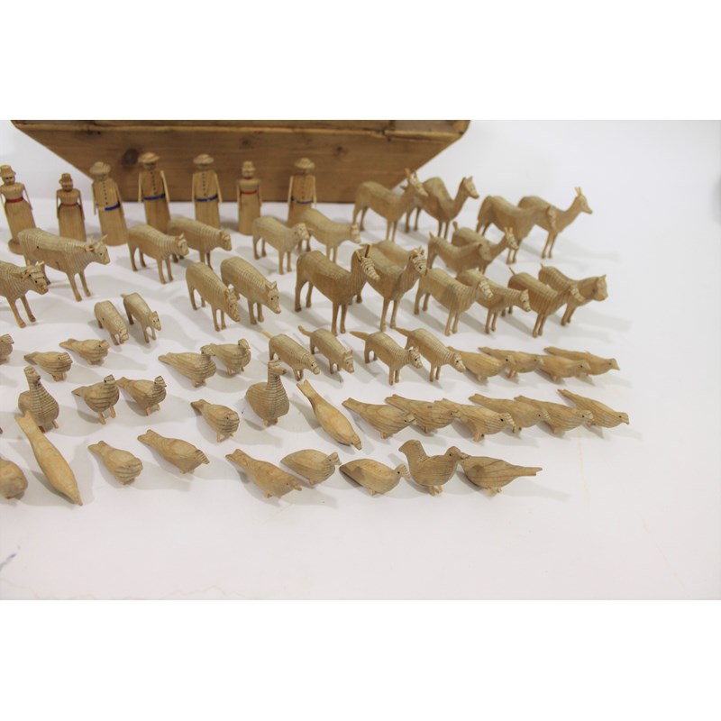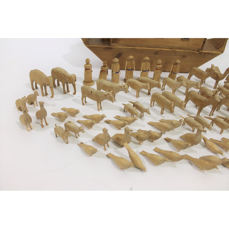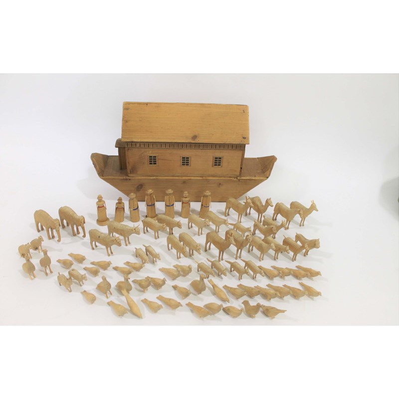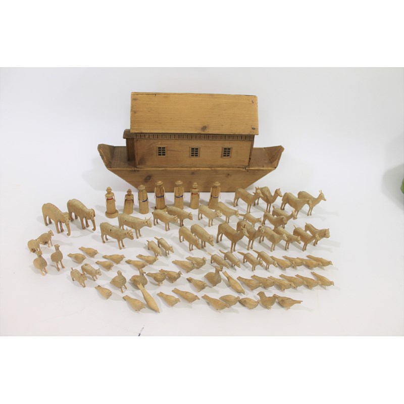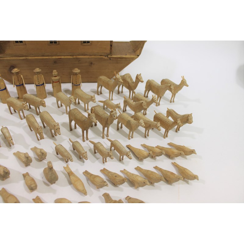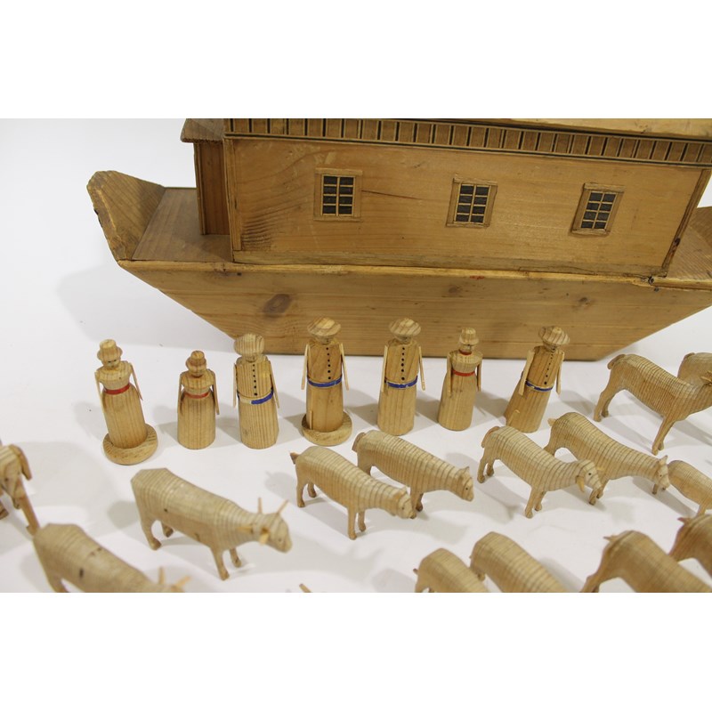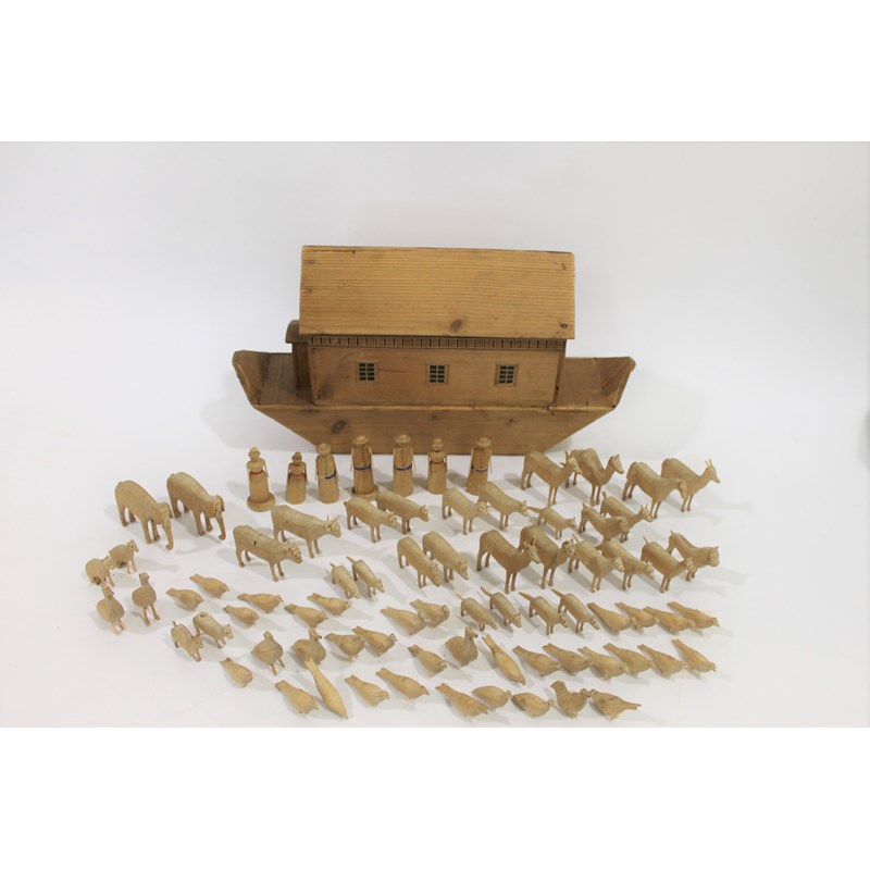 a German pine Noah's Ark with a sliding opening one one side, probably produced in the Erzgebirge region, circa 1880. Also with approx 70 animals figures and 7 human figures. Ark 44cms long, 24cms high