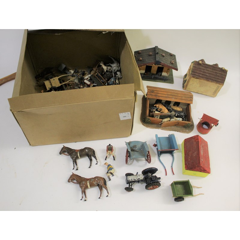 a mixed lot including various lead animals figures and animals, model buildings, farm accessories including carts, dog kennel etc.