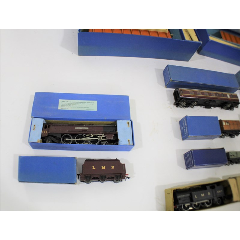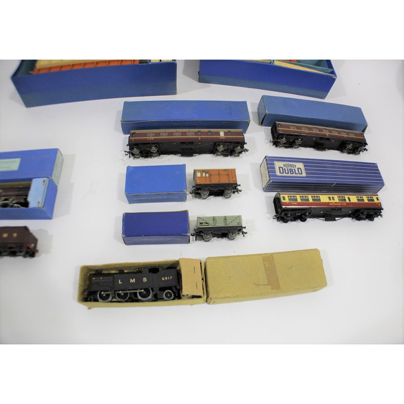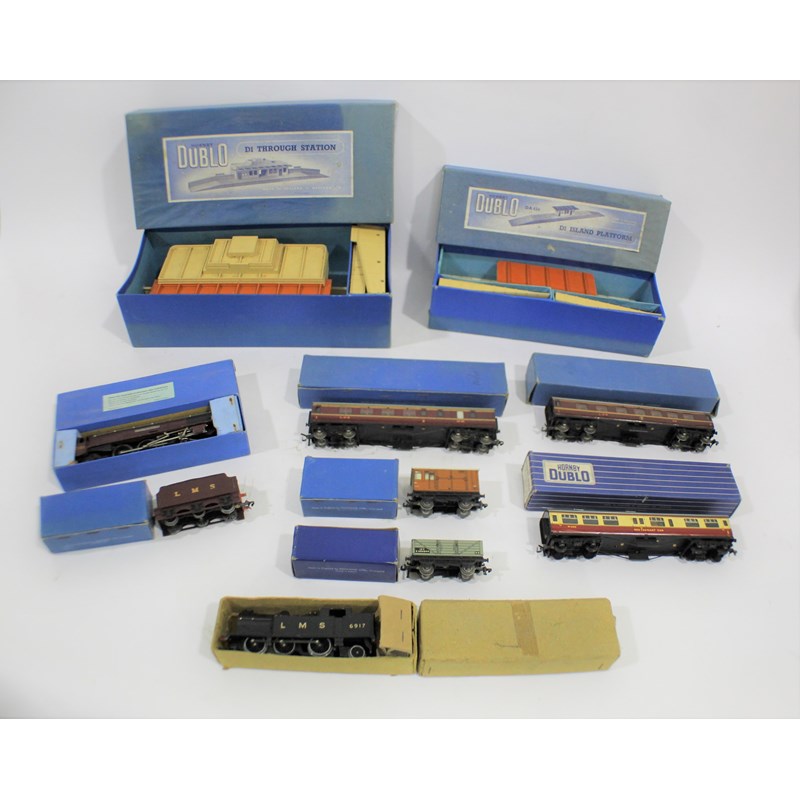 various boxed items including D1 Through Station, D1 Island Platform, EDL2 Duchess of Athol locomotive, D2 Tender LMS (32002), D3 Corridor Coach (2), D1 Horse Box, D1 Coal Wagon, and D20 Restaurant Car. Also with a Hornby LMS 6917 electric locomotive (in a plain buff box, marked 32942 on the end), and a Hornby Dublo box with various wagons, track, points etc.