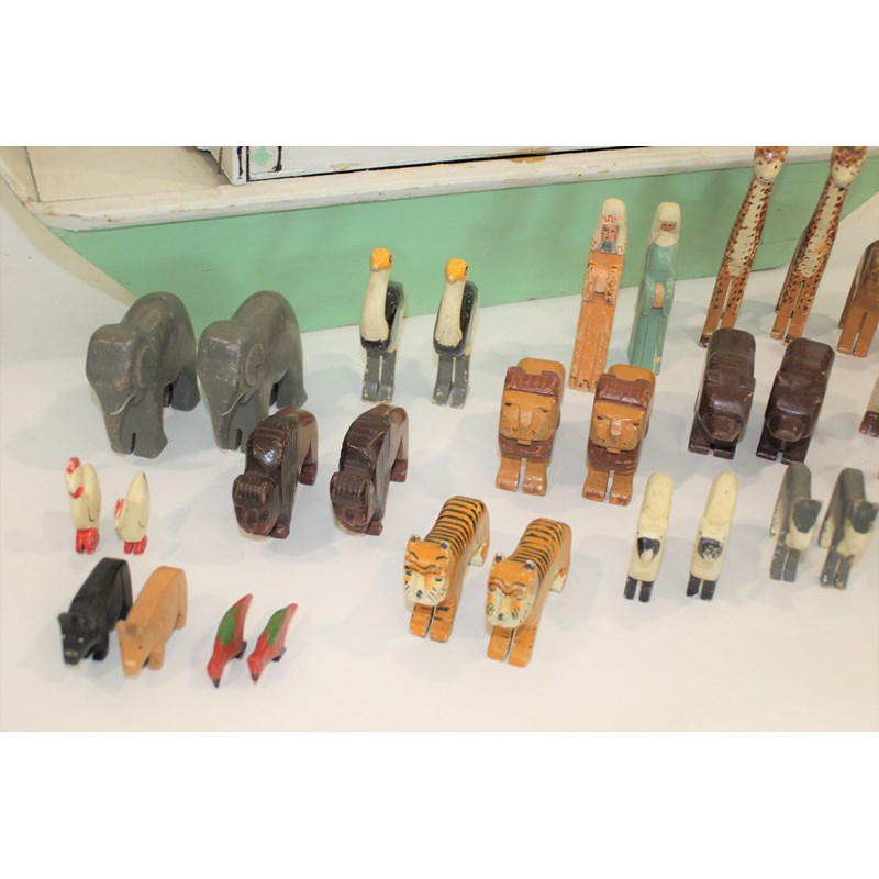 a painted pine wooden Noah's Ark, with an opening on one side of the roof. Also with a variety of carved and painted wooden animal figures, and Noah and his Wife. Ark marked on one end, War Relief Toy Work. Ark 87cms long