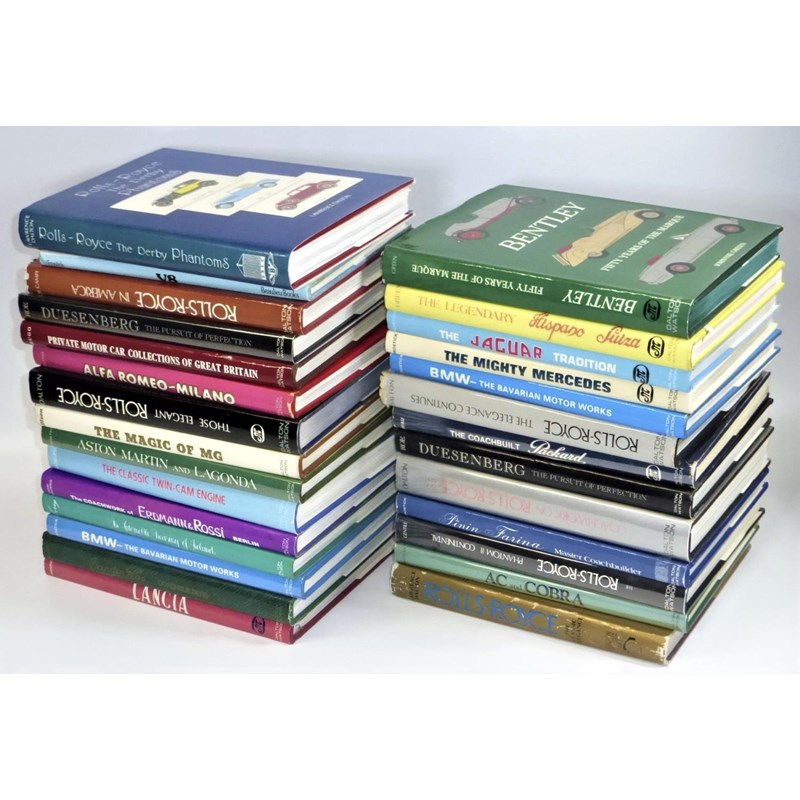A significant collection of books from the original Dalton Watson company, many edited and personally published by Lawrence Dalton. The collection consists of a number of rarities, and each book has a DJ, with most being 1st editions in very good condition save for several faded and slightly damaged spines: Bentley by Johnnie Green, signed by the author with a dedication, 1969; Rolls-Royce The Classic Elegance 1987; AC and Cobra by J. McLellan, 1982; The Rolls-Royce PII Continental by R. Gentle, 1980; Pinin Farina by Michael Frostick, 1977; Coachwork on Rolls-Royce 1906-1939, 1975; Duesenberg by Fred Roe, 1982, two copies; The Coachbuilt Packard by Hugo Pfau, 1975; Rolls-Royce The Elegance Continues, 1971; Lancia by Michael Frosrick, 1976; Vanden Plas by Brian Smith, 1979; BMW by Michael Frostick, 1976 & 1978; The Automobile Treasury of Ireland by Finbar Corry, 1979; The Coachwork of Erdmann & Rossi by Rupert Stuhlemmer, 1979; The Classic twin-Cam Engine by G. Borgeson, 1981; Aston Martin & Lagonda by M. Frostick, 1977; The Magic of MG by Mike Allison, 1978 Reprint; Those Elegant Rolls-Royce, 1968 2nd Imp; Alfa Romeo - Milano by M. Frostick, 1976 revised; The Mighty Mercedes by M. Frostick, 1979 reprint; The Jaguar Tradition by M. Frostick, 1979 reprint; The Legendary Hispano Suiza by Johnnie Green, 1977; Private Motor Car Collections of GB by Peter Hugo, 1973; Rolls-Royce in America by John de Campi, 1975; V8 by Michael Frostick, 1979. Also, Rolls-Royce The Derby Phantoms, by L. Dalton 1991 (signed). (28 books)