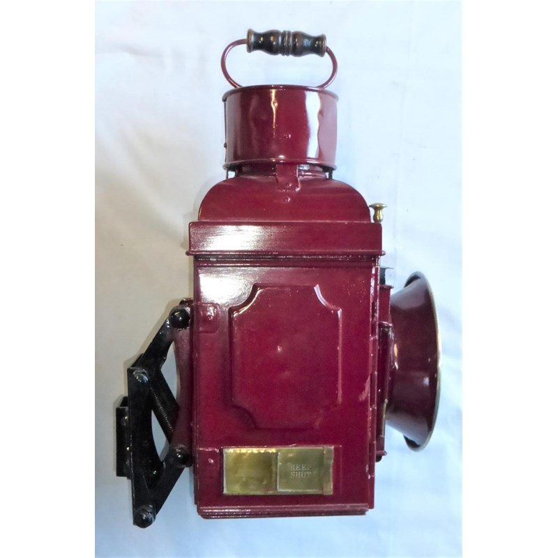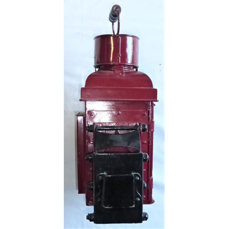 of imposing measurements, this particularly well-constructed lamp has a side opening door to access the oil reservoir, a sliding aperture to allow wick adjustment, a blanking sheet and holster, carrying bail with a turned wooden grip, and a substantial parallel-sprung mounting-bracket at the rear. With handle, 19-inches high.