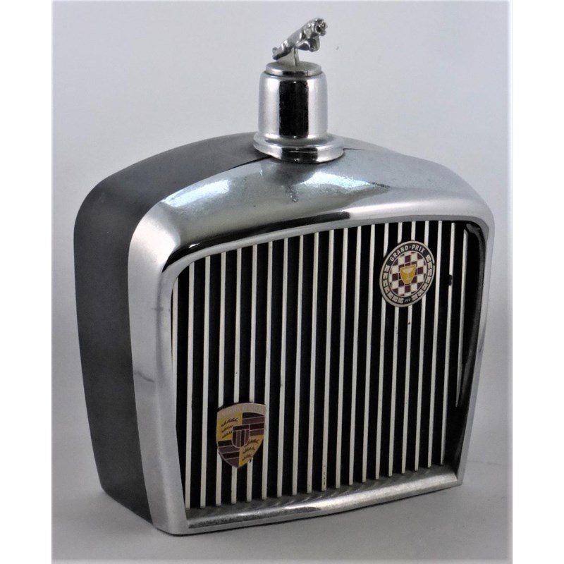 A JAGUAR DECANTER with a combination screw cap and cup, with a mounted Jaguar, chromium-plated grille. 7-inches high.