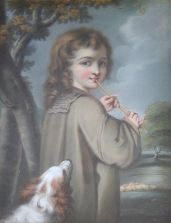 CIRCLE OF JOHN RAPHAEL SMITH (1752-1812) A YOUNG SHEPHERD BOY WITH A SPANIEL Pastels 45 x 34cm.