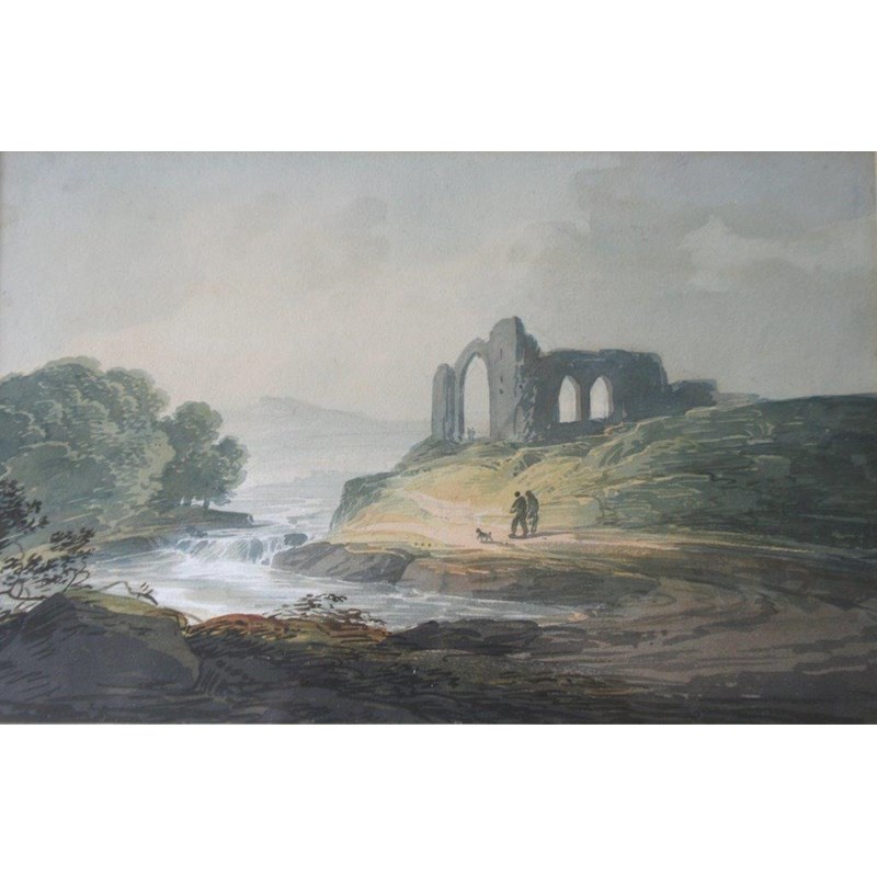 WILLIAM PAYNE (1760-1830) FIGURES BY A RUINED ABBEY AND RIVER Signed and dated 1800 verso, watercolour and pencil 18.5 x 28.5cm.
