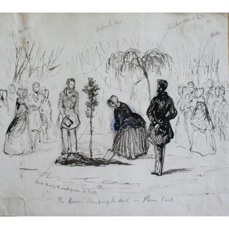 containing scores of sketches, apparently by more than one hand, comprising architectural, animal, portrait, figure, topographical and marine subjects etc; some depicting scenes of Queen Victoria (`Planting the Oak in Stowe Park`), one of crocodiles by an Indian lake, a Regatta at Ryde, many scraps etc; tipped or gummed down onto paper, without bindings, sold not subject to return, large folio/ledger