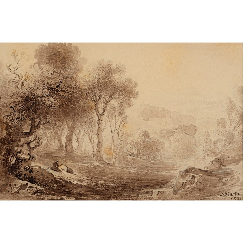 * This is typical of Martin's wash drawings of the period. It is not thought to be a `subject` piece but simply a Romanticized image, some of which were developed into more formal watercolours or engraved for Annuals of the mid-late 1820's. It is possible that Martin added the signature at a slightly later date but it is undoubtedly in his hand.