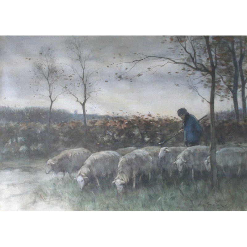 WILLEM STEELINK (1856-1928) SHEPHERD AND FLOCK AT TWILIGHT Signed, watercolour 35.5 x 50.5cm.