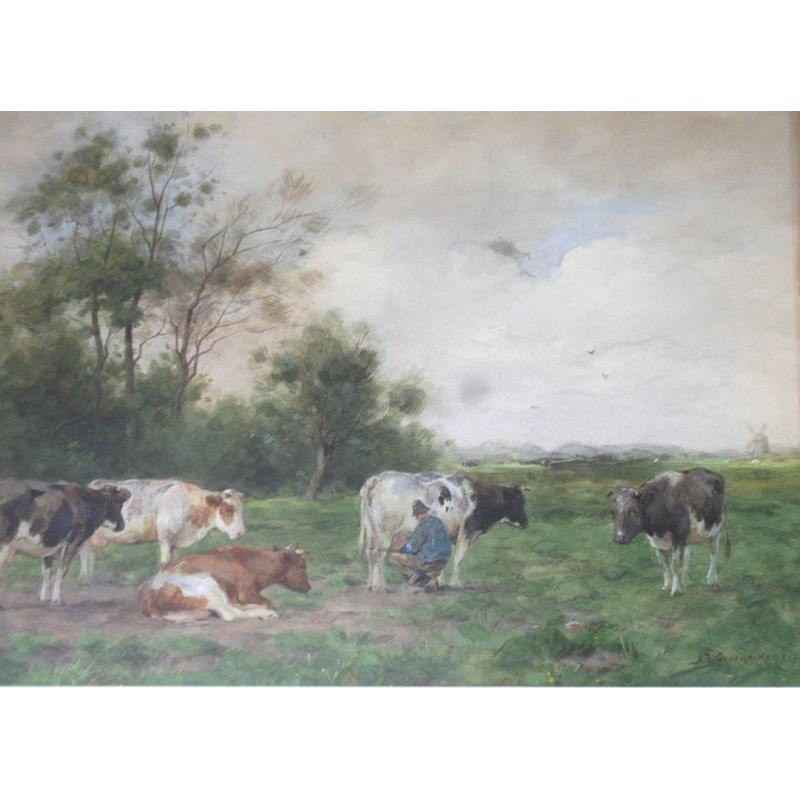 ‡ADRIANUS JOHANNES GROENEWEGEN (1874-1963) MILKING IN THE MEADOW Signed, watercolour and pencil 32.5 x 45cm.