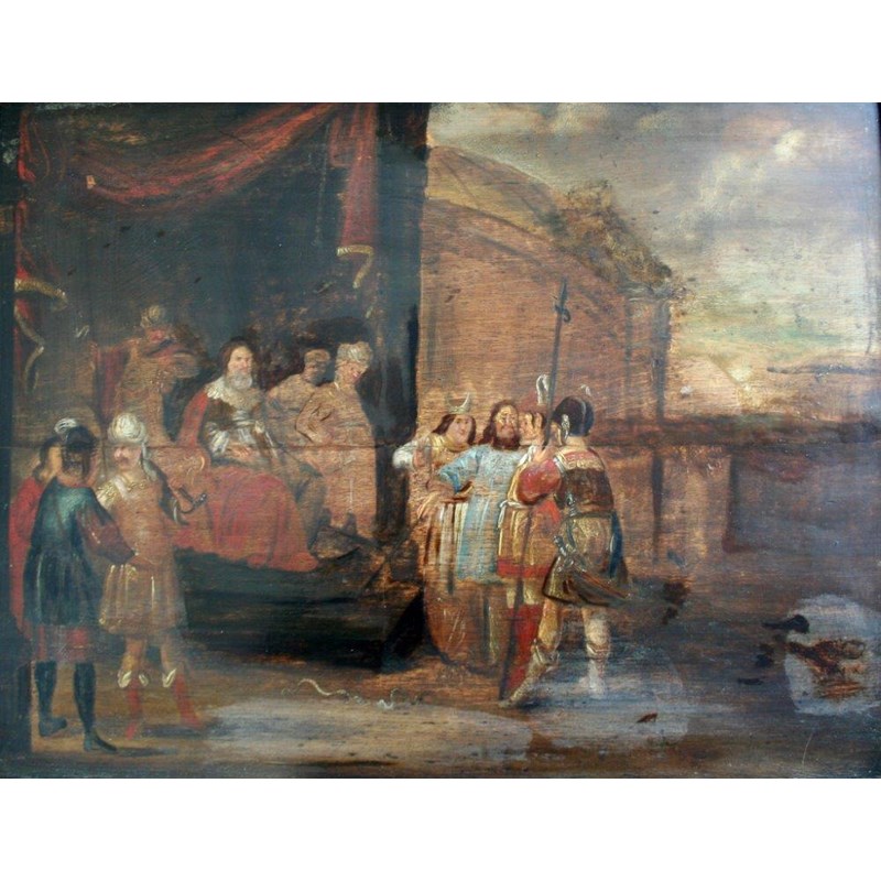 FOLLOWER OF JACOB WILLEMSZ DE WET (c.1610-c.1675) AARON CASTING HIS ROD BEFORE PHARAOH Oil on panel, unfinished 54.5 x 71.5cm.