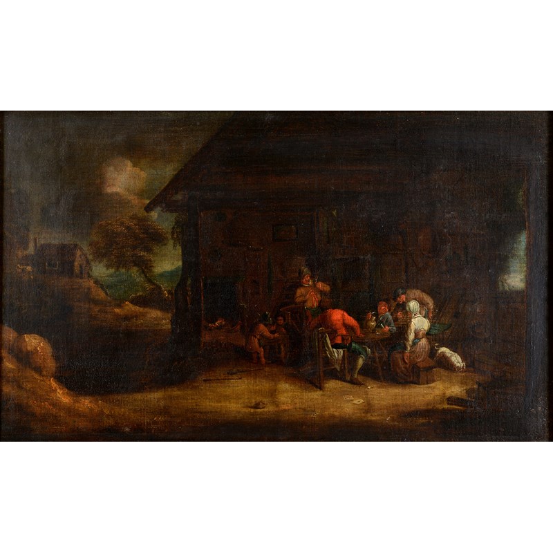 PEASANTS IN A TAVERN INTERIOR, A LANDSCAPE BEYOND