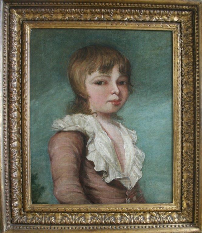 FOLLOWER OF GEORGE ROMNEY (1734-1802) PORTRAIT OF A BOY Quarter length, wearing a pink coat with a large white collar, oil on canvas 47 x 38.5cm.