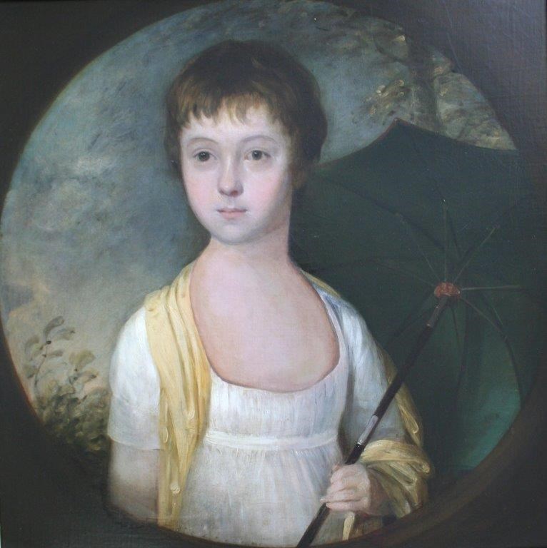 Half length, wearing a white dress and yellow shawl, holding a green parasol, within a painted circle, oil on canvas