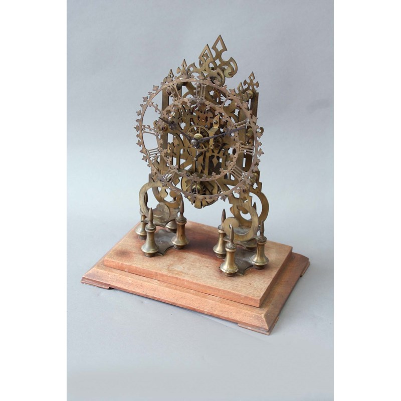 A BRASS SKELETON GOTHIC TIMEPIECE movement chain fusee, on a mahogany plinth, clock 14ins. (36cms.) high