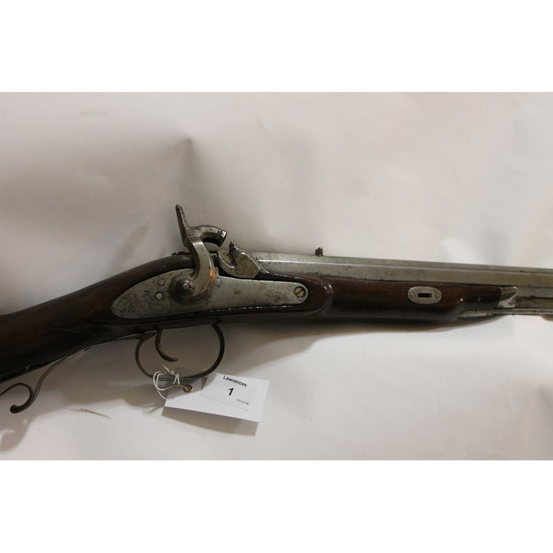 A percussion musket with trade lockplate converted from Flintlock. The date 1788 is also present on the plate, the butt with flap pocket. An octagonal barrel of 31.3/4" has ALWAR - 1027 marked on it. 47.3/4" overall length, with a steel ramrod below the barrel. Also a copper powder flask, marked G & J W Hawkesley.