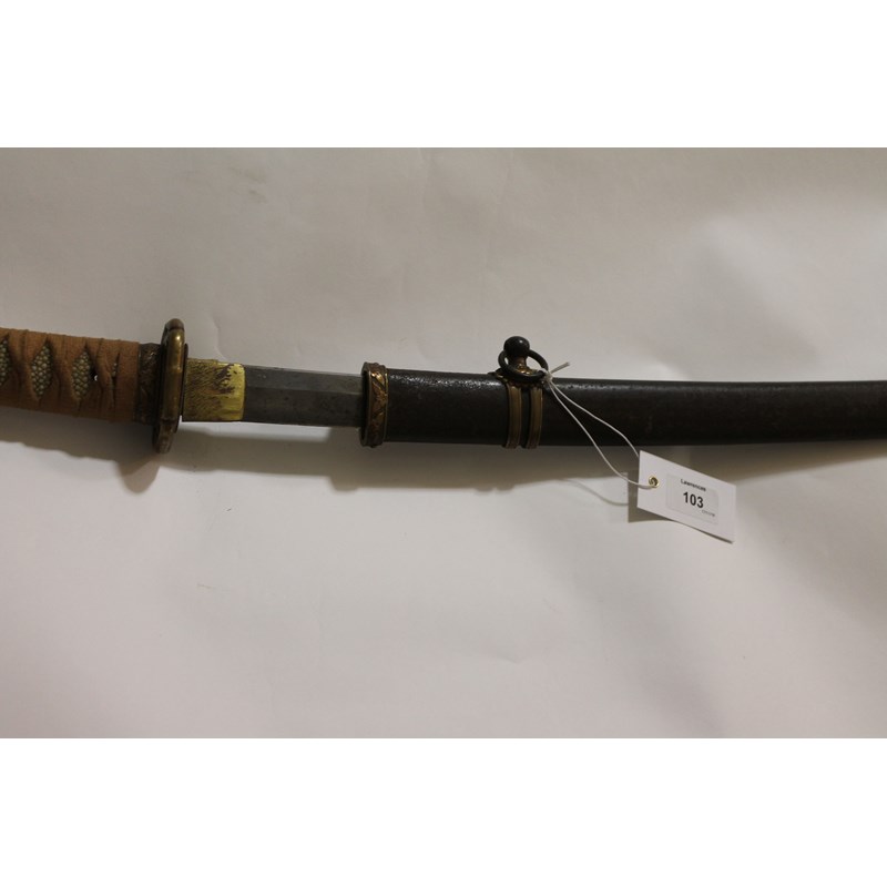 A Shin Gunto mounted Katana with steel scabbard and rebound hilt. The blade is unsigned though shortened from an earlier period, having two piercings in the tang. Some light staining to the 27" blade in places, the Menuki of Seahorse form.