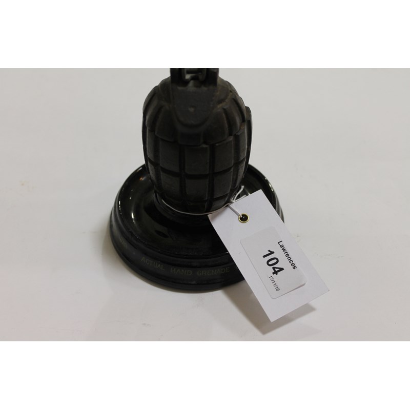 A GT WAR (GRENADE) DESK ORNAMENT. A porcelain plinth mounted Mills Grenade, with 'Momento of the Great War Actual Hand Grenade Casting as used by the Allies. Regd No 651542, with the lid opening using the handle.