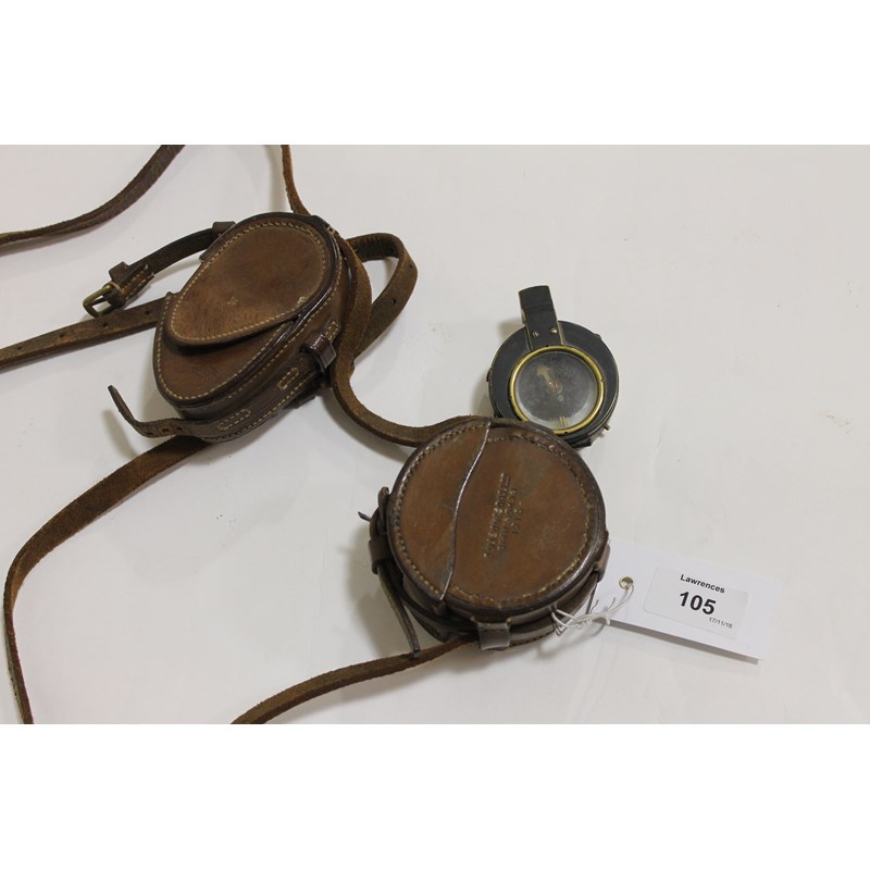 A brown leather cased Stanley of London 1919 dated sighting compass. A Cruchon and Emons of London marching compass, dated 1916. Both on a leater strap, one with Capt Arthur Brown 4th Kings marked on it.