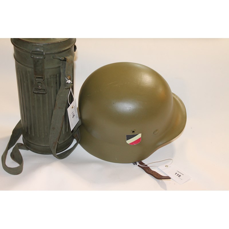 A COPY 1935 PATTERN GERMAN HELMET etc A copy or replica 35 pattern German helmet with army decals. Also a German Army style Gas Mask.
