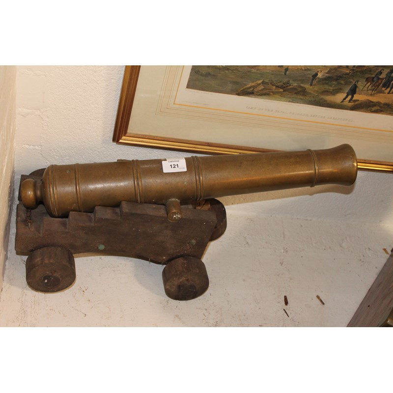 A brass 24" barrelled model signal cannon with partial trunnion, having a 1.1/4" internal bore (approximately). The wooden trunnion in a shipboard style, has need of repair/replacement.
